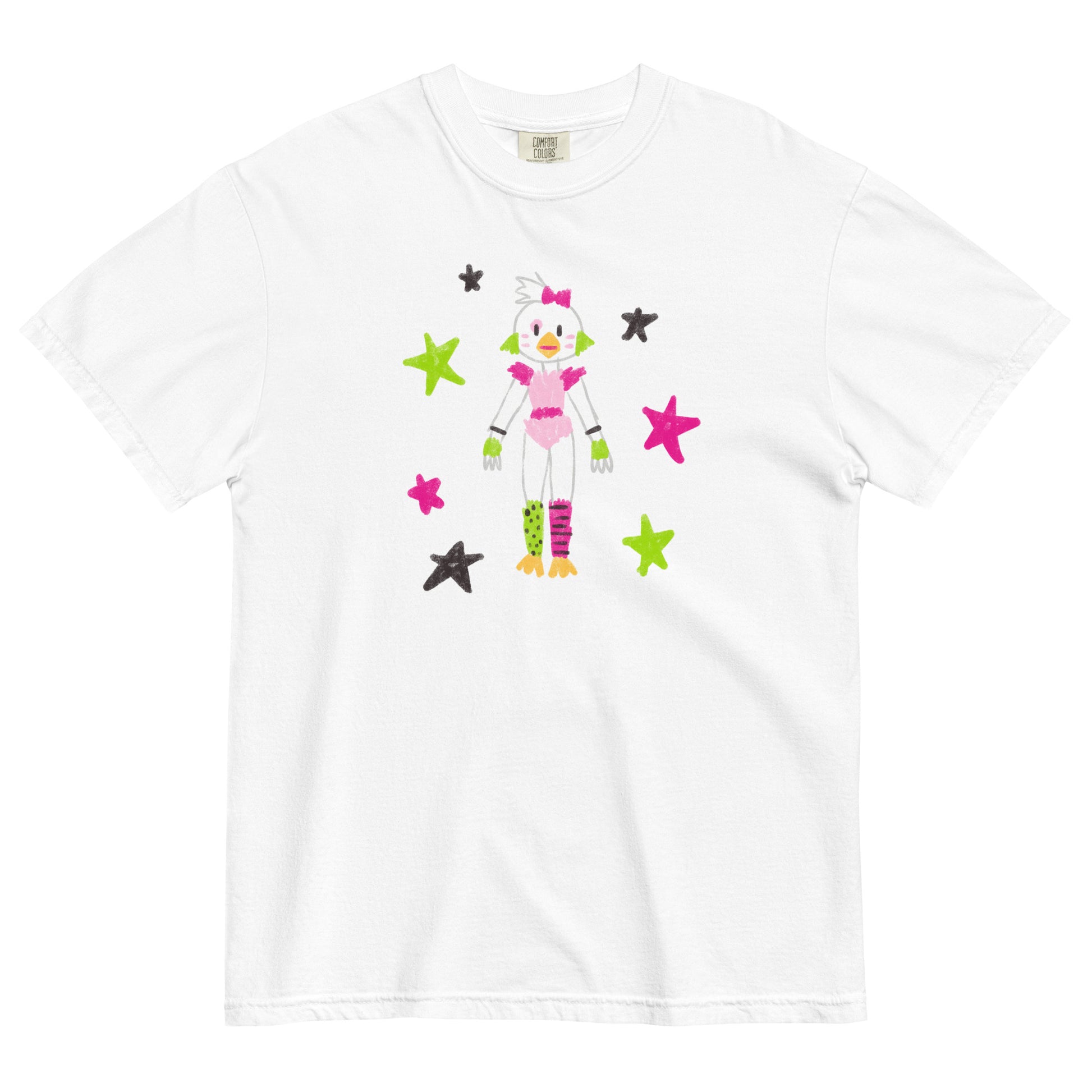 Flaunt your fandom with this trendy and cozy tee. Featuring an artfully crafted crayon drawing of this iconic FNAF character, this shirt is a must-have for gamers and Chica enthusiasts. Express your love for the animatronic world in style, as comfort meets creativity in every detail.